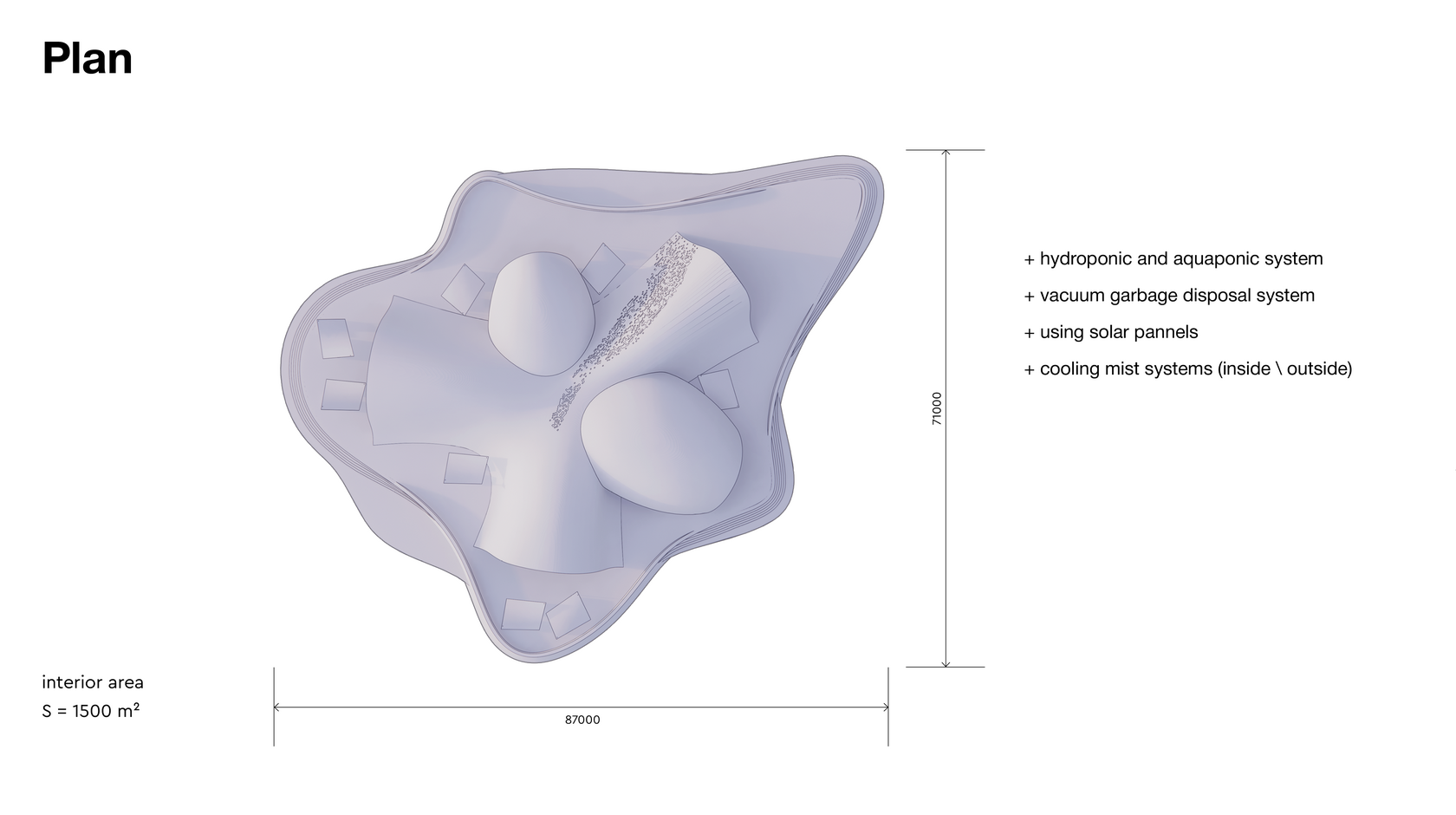 На платформе-палубе высажены деревья и другая растительность, вертикальная ферма с использованием гидропонной и аквапонной системами внутри комплекса.